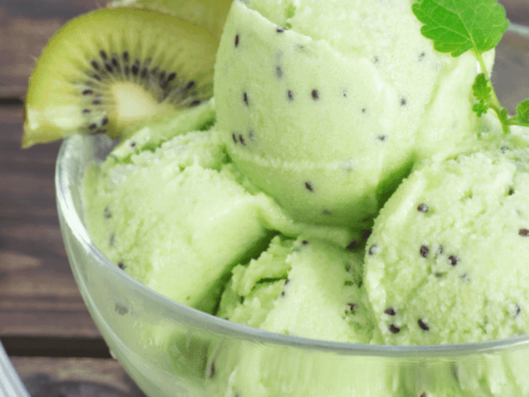 Ανακατέψτε κατεψυγμένα κομμάτια πολύ ώριμων ακτινίδιων σε έναν επεξεργαστή τροφίμων, μαζί με λίγο χυμό από lime και επιπλέον μέλι για να δώσετε μια πιο γλυκιά γεύση – προαιρετικά. Ρίξτε το μείγμα σε ένα ταψί (επιλέξατε ένα που μπορεί να αποθηκευτεί στην κατάψυξη) απλώστε το μείγμα σε ένα ομοιόμορφο στρώμα και καταψύξτε το για δύο ώρες. Σερβίρετε με το ειδικό κουτάλι παγωτού σε ένα μπολ και voila έτοιμο για απόλαυση.
