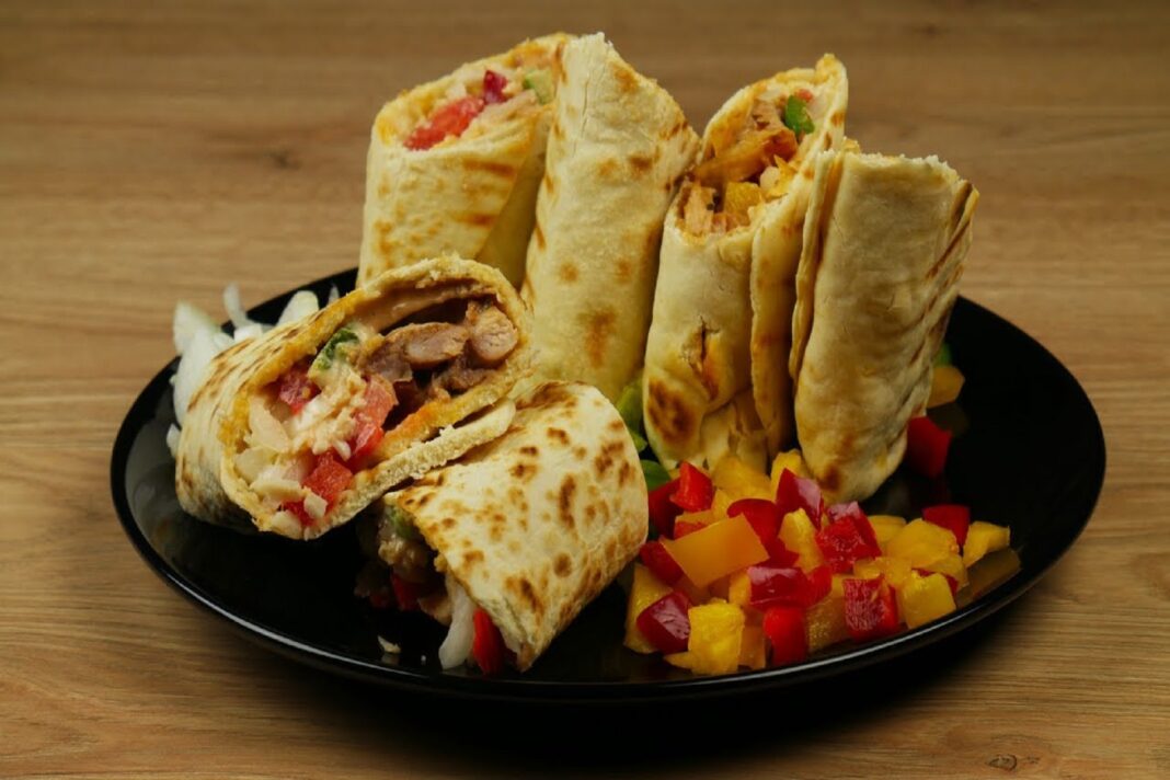 Ξεκινήστε με μία μεγάλη τορτίγια και κάντε μια σχισμή από την μία άκρη μέχρι την μέση της. Στη συνέχεια, τοποθετήστε το πρώτο υλικό στο κάτω δεξί τεταρτημόριο – προτιμήστε να βάλετε κάποια πρωτεΐνη, όπως κοτόπουλο ή αυγά.