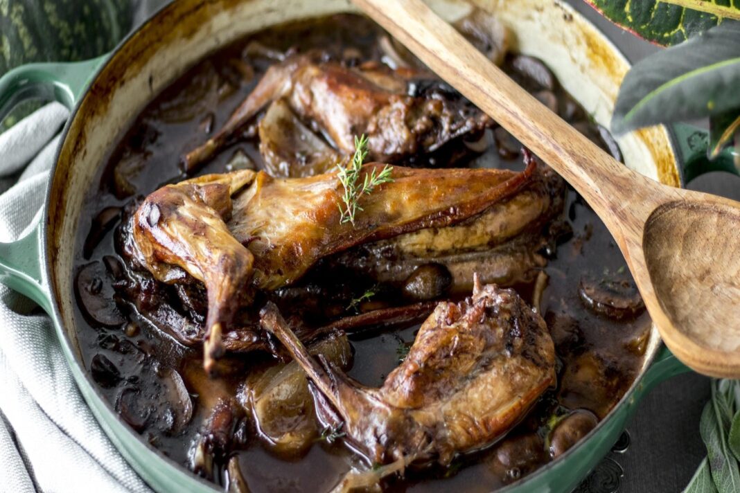Επιστρέψτε τα κομμάτια λαγού στην κατσαρόλα και ρίξτε τόσο ζωμό ή ζωμό ώστε να τα καλύψει όλα. Προσθέστε μερικά φύλλα δάφνης και μερικά κλωνάρια θυμάρι για να εμποτίσετε το στιφάδο με νότες βοτάνων. Αφήνουμε το μείγμα να σιγοβράσει απαλά, στη συνέχεια σκεπάζουμε την κατσαρόλα και το αφήνουμε να ψηθεί για περίπου μία ώρα ή μέχρι να μαλακώσει ο λαγός και να πέσει από το κόκαλο. Καθώς το στιφάδο σιγοβράζει, οι γεύσεις θα ενωθούν, δημιουργώντας έναν πλούσιο και αλμυρό ζωμό. Δοκιμάζουμε και προσαρμόζουμε το καρύκευμα όπως χρειάζεται, προσθέτοντας κι άλλο αλάτι και πιπέρι αν θέλουμε.
