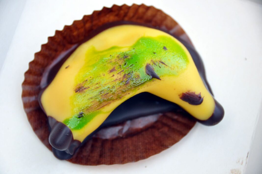 Προσθέτουμε 100γρ μαρμελάδα μπανάνας και ανακατεύουμε ξανά. Προσθέστε κοσκινισμένη άχνη ζάχαρη και μερικά κουταλάκια του γλυκού γάλα και συνεχίστε να ανακατεύετε. Το μείγμα πρέπει να είναι κρεμώδες, αλλά σκληρό. Κόψτε 12 μικρές στρογγυλές κέικ χρησιμοποιώντας ένα ποτήρι και κόψτε κάθε στρώση κέικ στη μέση. Απλώστε λίγη μαρμελάδα φράουλα και βάλτε τη βουτυρόκρεμα σε ένα σακουλάκι και περάστε τη στα κέικ. Από πάνω βάζουμε τις άλλες στρώσεις κέικ. Απλώστε λίγη μαρμελάδα μπανάνας πάνω από τα κέικ και βουτυρόκρεμα στην κορυφή τους και βάλτε τα στην κατάψυξη για 1 ώρα. Ανακατέψτε το χρώμα ζαχαροπλαστικής με τη ζάχαρη άχνη και ζυμώστε το καλά μέχρι να κατανεμηθεί ομοιόμορφα το χρώμα. Τώρα πλάστε το αμυγδαλωτό σε οβάλ σχήμα. Έπειτα διπλώστε την έτοιμη αμυγδαλόπαστα γύρω από το κέικ.