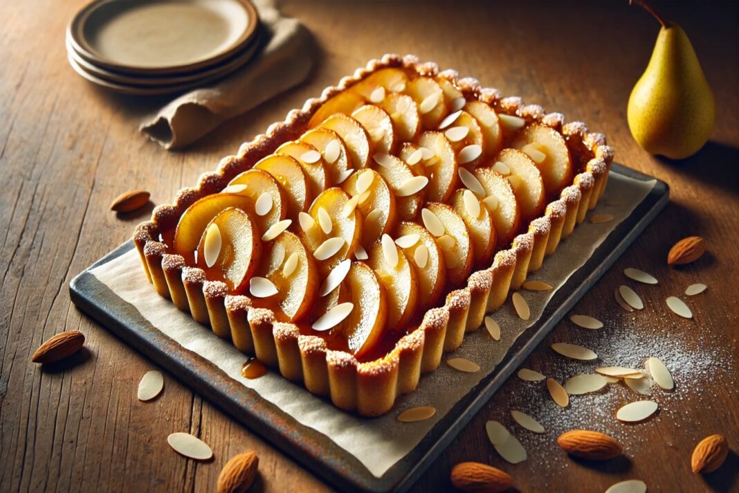 Αυτή η καραμελωμένη τάρτα με αχλάδι και αμύγδαλο είναι ένα απλό αλλά κομψό επιδόρπιο που αναδεικνύει τη φυσική γλυκύτητα των ώριμων αχλαδιών, ενισχυμένη από καραμέλα και βουτυρένια βάση αμυγδάλου.