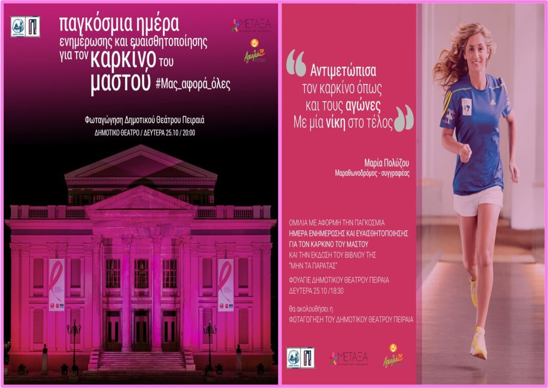 - Τη Δευτέρα 25 Οκτωβρίου στις 18:30 ο Δήμος Πειραιά και ο ΟΕΕΚ – ΑγκαλιάΖΩ διοργανώνουν εσπερίδα ενημέρωσης και ευαισθητοποίησης για τον καρκίνο του μαστού στο Φουαγιέ του Δημοτικού Θεάτρου Πειραιά, με τίτλο: «Καρκίνος Μαστού: Μας αφορά όλες». Ομιλητές θα είναι η Διευθύντρια, υπεύθυνη της Μονάδας Μαστού του «Μεταξά» κα Ελευθερία Β. Ιγνατιάδου, ο Επιμελητής Α’ της Μονάδας, κ. Παύλος Λαμπρόπουλος, καθώς και η Πρωταθλήτρια Μαραθωνοδρόμος Μαρία Πολύζου, η οποία έδωσε τη δική της «μάχη» με τον καρκίνο του μαστού και βγήκε νικήτρια.