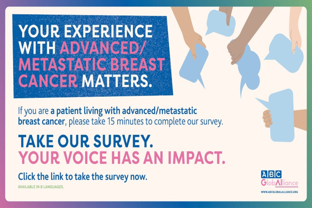 Αν είστε ασθενής που ζει με μεταστατικό καρκίνο μαστού ή επαγγελματίας υγείας που ασχολείται με ασθενείς με μετάσταση, μπορείτε να αφιερώσετε 15 λεπτά από τον χρόνο σας για να συμπληρώσετε την έρευνα που διεξάγει η ABC Global Alliance (στην αγγλική γλώσσα). https://www.abcglobalalliance.org/abc-global-charter-report#2025-2035.