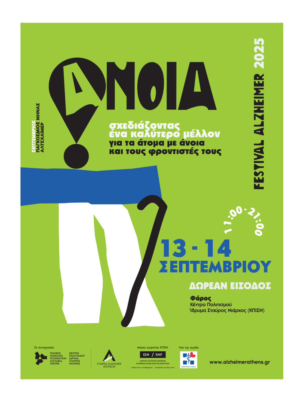 Από τις 11.00 έως τις 21.00, στον Φάρο του ΚΠΙΣΝ και με ελεύθερη είσοδο για όλες και όλους, το Alzheimer Festival 2025 περιλαμβάνει σειρά επιστημονικών ομιλιών, διαδραστικών εκδηλώσεων αλλά και δράσεων συνηγορίας και διεκδίκησης, με σκοπό την ουσιαστική στήριξη της κοινότητας της άνοιας, καθώς και την ενημέρωση και εγρήγορση του κοινού για τη νόσο Alzheimer.