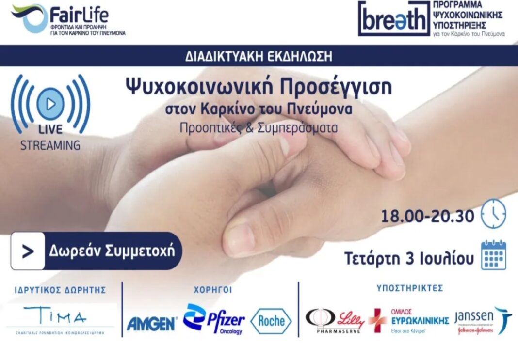 Το Πρόγραμμα BREATH έχει σχεδιαστεί για να παρέχει ολοκληρωμένη ψυχοκοινωνική υποστήριξη στον καρκίνο του πνεύμονα, αναγνωρίζοντας την αναγκαιότητα της ενδυνάμωσης των ασθενών και των φροντιστών τους. Την εκδήλωση συντονίζει η δημοσιογράφος Νατάσσα Σπαγαδώρου. Διαβάστε περισσότερα για το πρόγραμμα εδώ https://fairlifelcc.com/breath-programma-psychokoinonikis-ypostirixis/