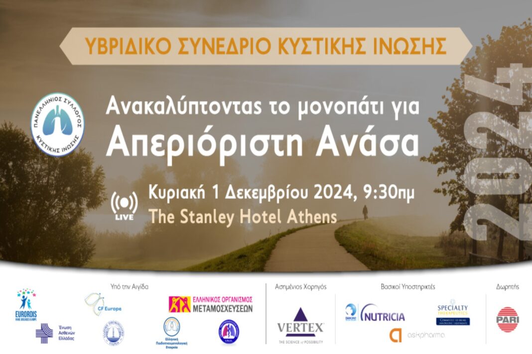 Ο Πανελλήνιος Σύλλογος Κυστικής Ίνωσης διοργανώνει το Υβριδικό Συνέδριο “Ανακαλύπτοντας το Μονοπάτι για Απεριόριστη Ανάσα“, στα πλαίσια της Ευρωπαϊκής Εβδομάδας Κυστικής Ίνωσης (18-24/11), υπό την Αιγίδα του Ελληνικού Οργανισμού Μεταμοσχεύσεων, της Ελληνικής Πνευμονολογικής Εταιρείας, της Ένωσης Πνευμονολόγων Ελλάδος, της Ελληνικής Παιδοπνευμονολογικής Εταιρείας, του EURORDIS- Rare Diseases Europe, του CF Europe και της Ένωσης Ασθενών Ελλάδας.