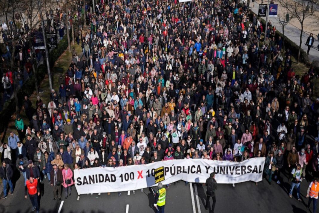 Εκατοντάδες χιλιάδες Ισπανοί πλημμύρισαν τους δρόμους της Μαδρίτης την Κυριακή για τη μεγαλύτερη διαμαρτυρία ενάντια στη διαχείριση των υπηρεσιών υγείας της πρωτεύουσας από την περιφερειακή κυβέρνηση. Πάνω από 250.000 άνθρωποι διαδήλωσαν στο κέντρο της πόλης, σύμφωνα με την κεντρική ισπανική κυβέρνηση. Οι διοργανωτές ισχυρίστηκαν ότι το πλήθος ήταν μεγαλύτερο κατά αρκετές εκατοντάδες χιλιάδες. Πολλοί συμμετέχοντες στη διαδήλωση έφεραν πινακίδες με μηνύματα στα ισπανικά όπως «Το δικαίωμα στην υγεία είναι ανθρώπινο δικαίωμα. Υπερασπίσου την υπηρεσία υγείας».