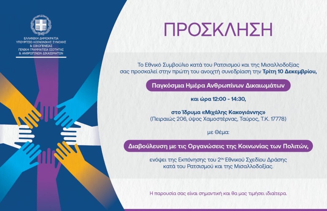 Το Εθνικό Συμβούλιο κατά του Ρατσισμού και της Μισαλλοδοξίας σας προσκαλεί στην πρώτη του ανοικτή συνεδρίαση την Τρίτη 10 Δεκεμβρίου, Παγκόσμια Ημέρα Ανθρωπίνων Δικαιωμάτων και ώρα 12:00 – 14:30, στο Ίδρυμα “Μιχάλης Κακογιάννης” (Πειραιώς 206, ύψος Χαμοστέρνας, Ταύρος, Τ.Κ. 17778) με θέμα: